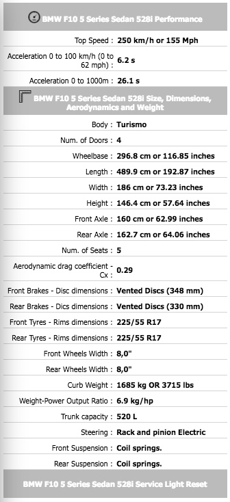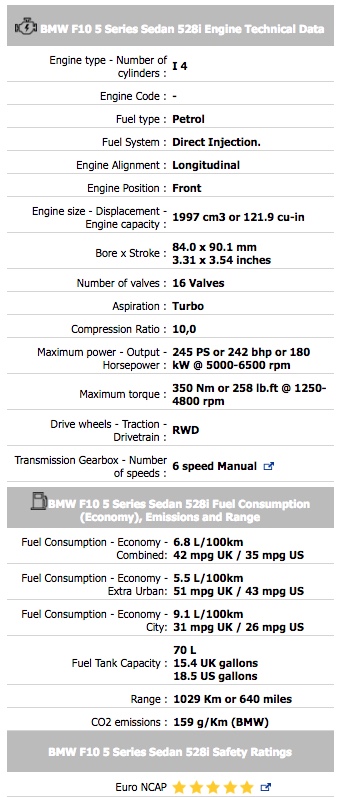 With a fuel consumption of 6.8 litres/100km – 42 mpg UK – 35 mpg US (Average), 0 to 100 km/h (62mph) in 6.2 seconds, a maximum top speed of 155 mph (250 km/h), a curb weight of 3715 lbs (1685 kgs), the F10 5 Series Sedan 528i has a turbocharged In-line 4 cylinder engine, Petrol motor.